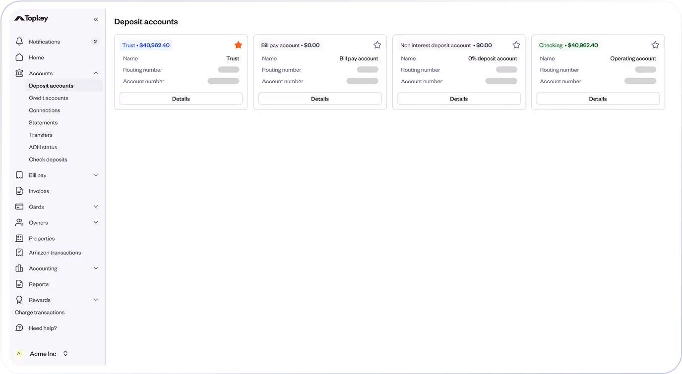 Topkey provides property managers access to a full suite of banking solutions to help you manage money smarter, without having to work harder.