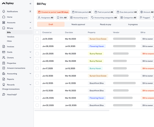 Eliminate bottlenecks and errors in your payables process. Topkey reads invoices, applies markups, tags properties, and syncs payments back to your PMS and accounting system automatically—giving you full control and instant clarity.