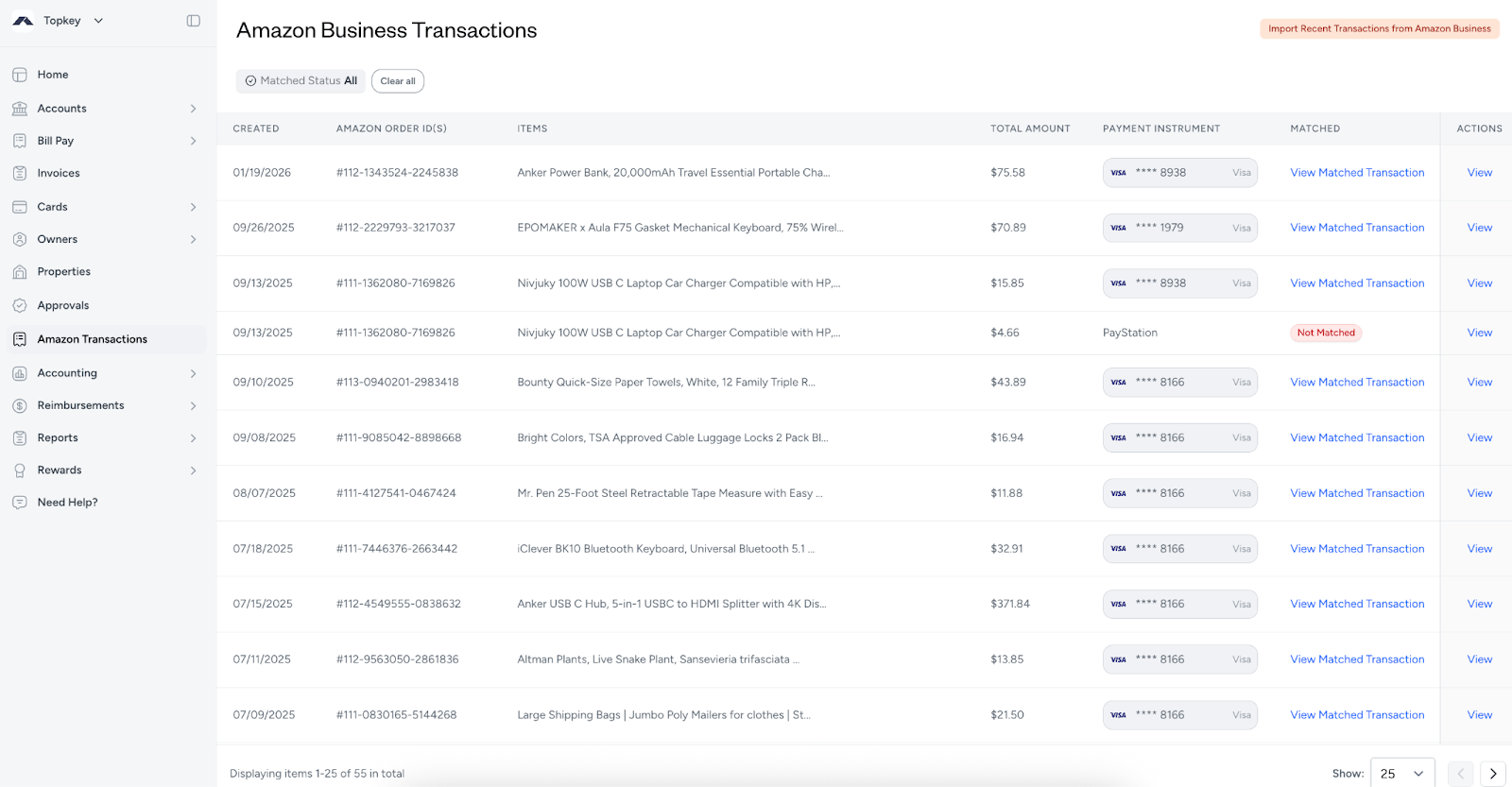 Here's where Topkey changes everything. When you connect your Amazon Business account to Topkey, the system starts pulling order data from Amazon automatically. At the same time, it's receiving transaction data from your card provider.