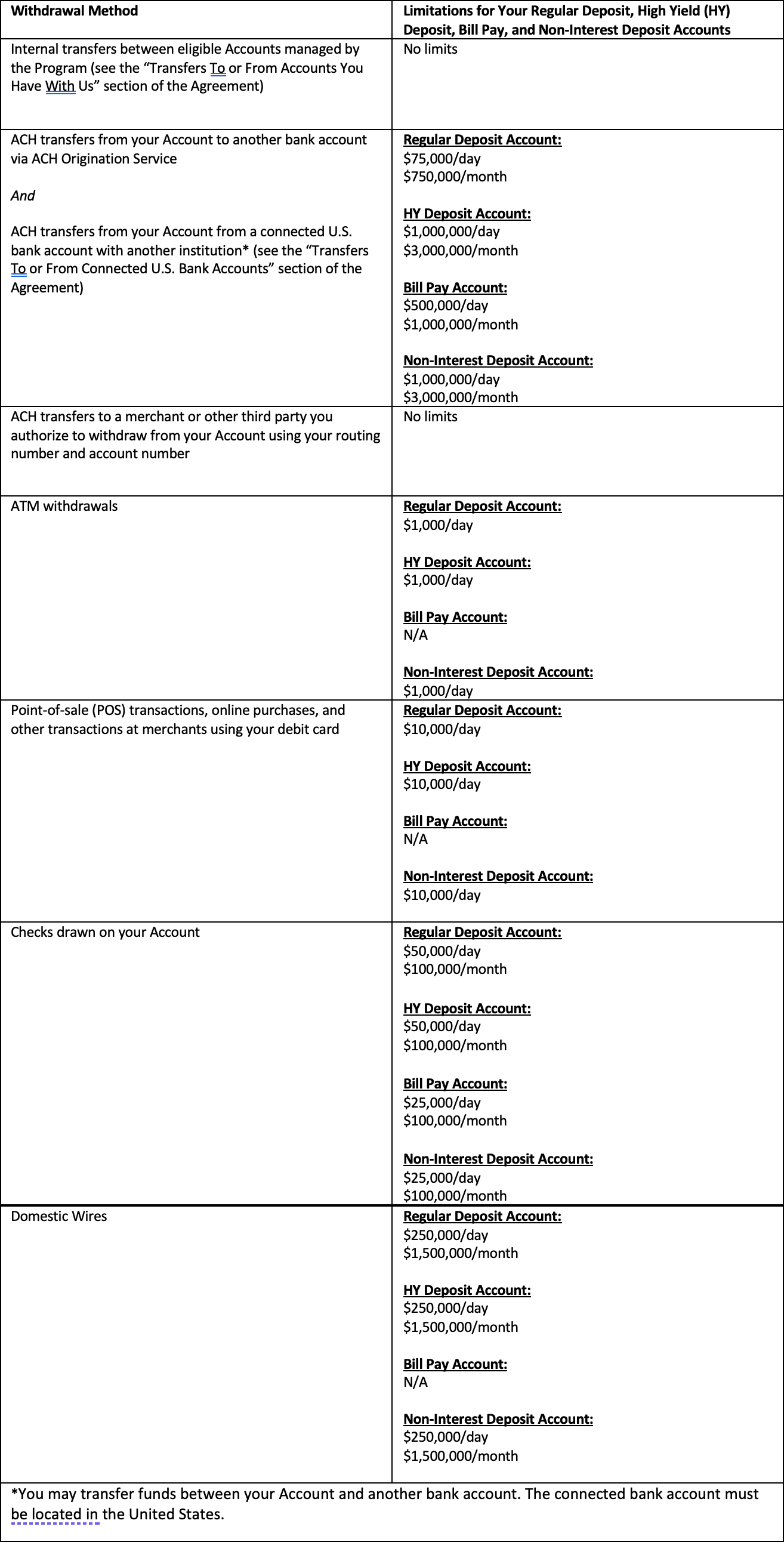 It is our policy to make deposits to your Account available for withdrawal according to the table provided in the “Our Funds Availability Policy” section of the Agreement, except where limited by us pursuant to the “Transfers To or From Connected U.S. Bank Accounts” section of the Agreement.