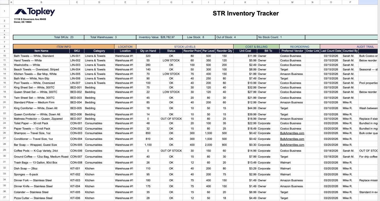 This Inventory Tracker provides a single-tab system for managing all physical inventory across your vacation rental operation — whether you have one warehouse or five, 50 SKUs or 1000+.